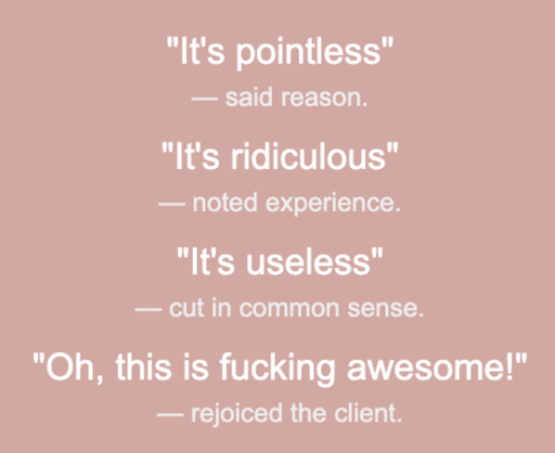 One time a client of the first type complemented us for the inclusion of a certain feature in the application. It was a mistake, shouldn’t have been there. But he was so happy about it and so… it’s still there