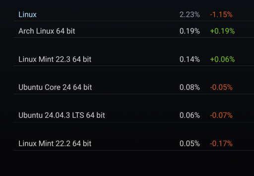Looking at the huge spike in Simplified Chinese number, it seems like yet another oversampling of Chinese computers. A more reliable metric is Linux share for computers with English as their language, currently at >8% for the first time.